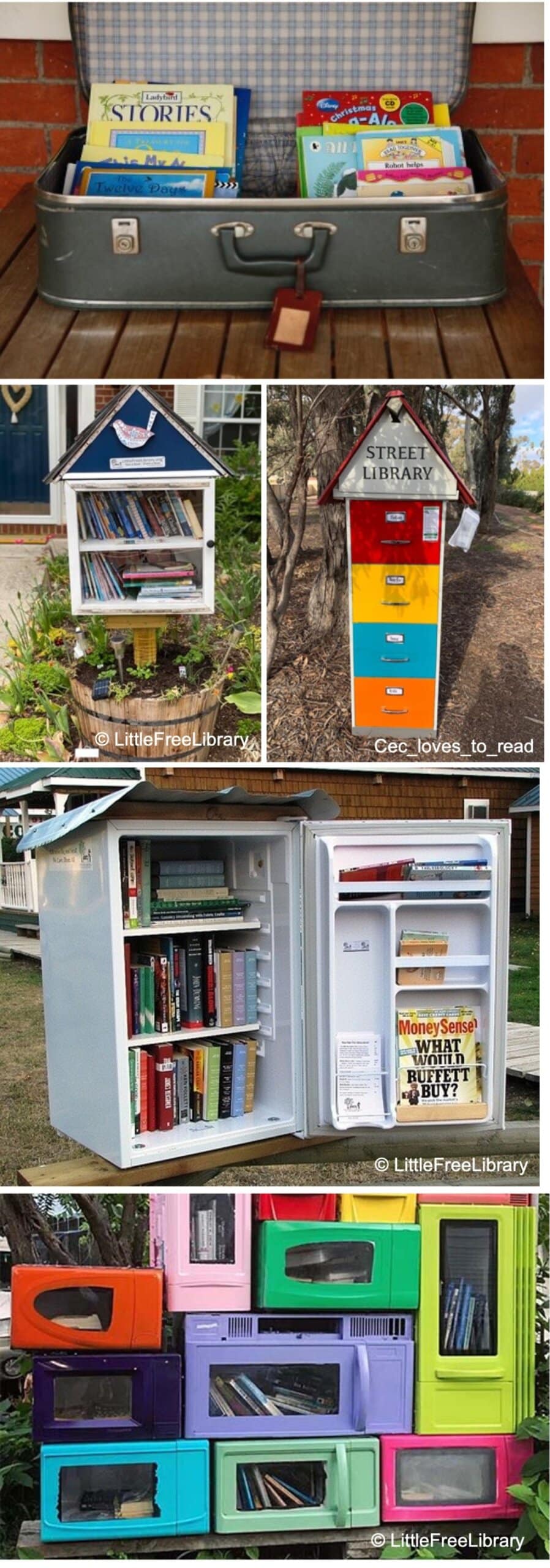 Une petite étagère vitrée, un chiffonnier, une armoire en métal… tous les types d’armoires peuvent être réutilisée en kiosque à livres. Une fois encore, les enfants peuvent participer en fabriquant un petit toit, un écriteau ou encore un pied avec un seau de terre et quelques plantes. Quelques coups de pinceaux de peintures colorées pour donner du peps à l’ensemble et un peu de vernis en spray pour la protéger de la pluie et le tour est joué !