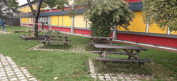 « Les deux cours étaient auparavant séparées par un espace en herbe qui n’était pas accessible aux enfants. Un premier projet a permis de les faire communiquer et d’y installer des tables de pique-nique. Cela a beaucoup plu aux enfants et nous a donné envie de continuer dans cette direction. »